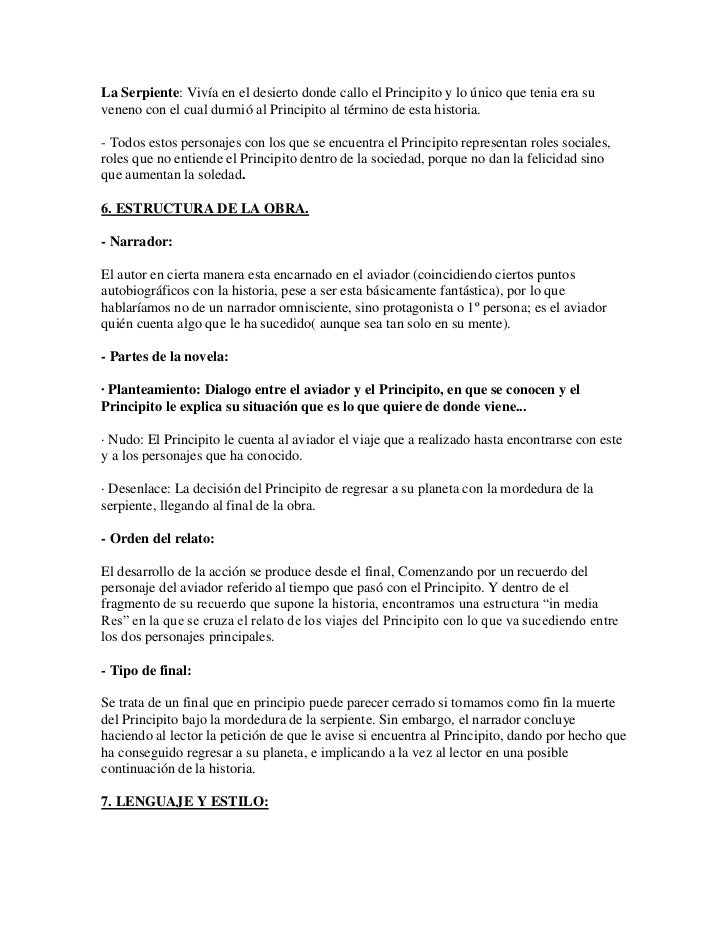 El final del principito es el final de un libro tan bello que parece mentira que el hombre sea capaz de tanta maldad e ignorancia. Sabe comunicarse con la naturaleza y cuando se siente en peligro se convierte en un príncipe con una espada mágica, que le permite crear seres fantásticos que lo ayudan en las diferentes aventuras que emprende. La pequeña es muy seria y madura para su edad y planea estudiar durante las vacaciones siguiendo un estricto programa organizado por su madre. Resulta agradable leer un libro que conecta perfectamente con tus ideas sobre la vida, todo lo que el autor perdió y recupera al final del libro es importante conservarlo para vivir felizmente. Inicio desarrollo y final del principito :